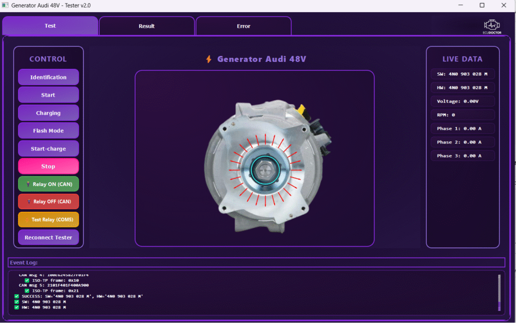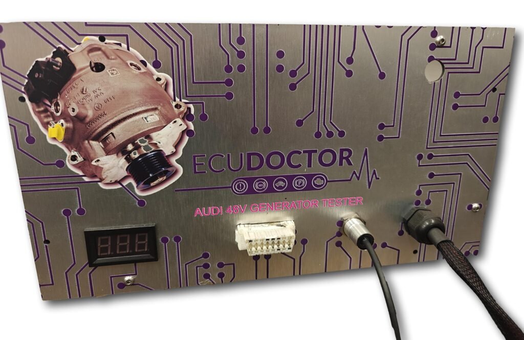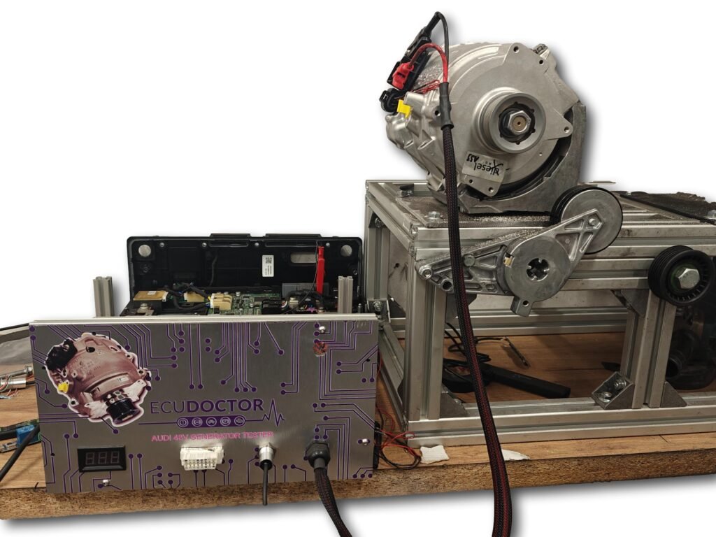 Najczęściej spotykanym uszkodzeniem w generatorach BSG (Belt Starter Generator) jest przepalenie grupy tranzystorów IGBT. Ponieważ alternator ma konstrukcję silnika bezszczotkowego, to właśnie te tranzystory oraz ich układ sterujący stanowią kluczowe elementy całego systemu. W naszej firmie opracowaliśmy skuteczny proces wymiany uszkodzonych podzespołów oraz zbudowaliśmy autorskie stanowisko testowe. Każdy alternator przechodzi na nim długotrwałe obciążenia zarówno w trybie rozruchowym, jak i podczas pracy generacyjnej. Dedykowane oprogramowanie monitoruje parametry napięciowe i prądowe oraz zapisuje je do końcowego raportu.