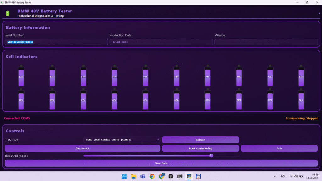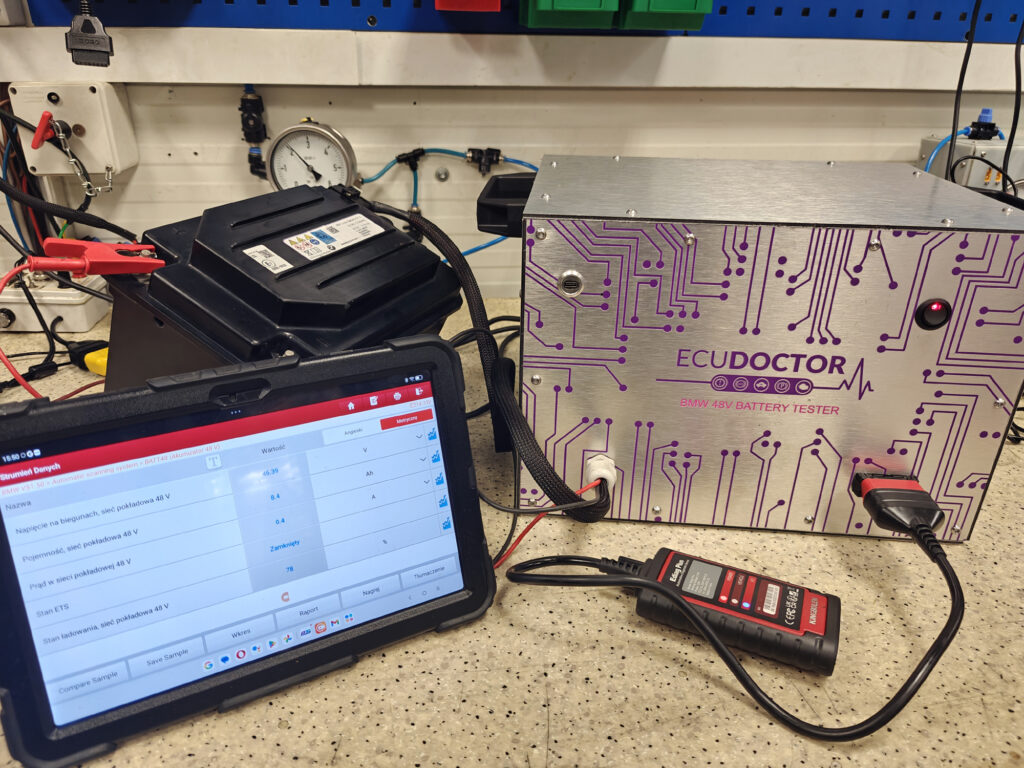 W kolejnym etapie akumulator zostaje podłączony do naszego autorskiego stanowiska testowego, gdzie – za pośrednictwem złącza diagnostycznego – odczytywane są szczegółowe parametry pracy oraz usuwane ewentualne błędy.
